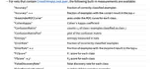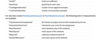 "Accuracy" fraction of correctly classified examples "Accuracy"n fraction of examples with the correct result in the top n "AreaUnderROCCurve" area under the ROC curve for each class "CohenKappa" Cohen's kappa coefficient "ConfusionMatrix" counts cij of class i examples classified as class j "ConfusionMatrixPlot" plot of the confusion matrix "Entropy" entropy measured in nats "ErrorRate" fraction of incorrectly classified examples "ErrorRate"n fraction of examples with the incorrect result in the top n "F1Score" F1 score for each class "FScore"β Fβ score for each class "FalseDiscoveryRate" false discovery rate for each class "FalseNegativeNumber" number of false negative examples "FalseNegativeRate" false negative rate for each class "FalseOmissionRate" false omission rate for each class "FalsePositiveNumber" number of false positive examples "FalsePositiveRate" false positive rate for each class "Informedness" informedness for each class "Markedness" markedness for each class "MatthewsCorrelationCoefficient" Matthews correlation coefficient for each class "NegativePredictiveValue" negative predictive value for each class "Perplexity" exponential of the entropy "Precision" precision for each class "Recall" recall rate for each class "ROCCurve" receiver operating characteristics (ROC) curve for each class "ROCCurvePlot" plot of the ROC curve "ScottPi" Scott's pi coefficient "Specificity" specificity for each class "TrueNegativeNumber" number of true negative examples "TruePositiveNumber" number of true positive examples - For nets that contain MeanSquaredLossLayer or MeanAbsoluteLossLayer, the following built-in measurements are available: