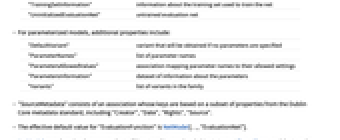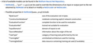 "ByteCount" size of the evaluation net in bytes "ConstructionNotebook" notebook containing explicit network construction "EvaluationFunction" complete function to be used for evaluation "EvaluationNet" trained net suitable for evaluation "InputDomains" domain of inputs to net "SourceMetadata" information about the origin of the net "TaskType" category of learning task performed by the net "TrainingNet" uninitialized architecture used for training "TrainingSetData" data resource containing training set used (if available) "TrainingSetInformation" information about the training set used to train the net "UninitializedEvaluationNet" untrained evaluation net - For parameterized models, additional properties include: