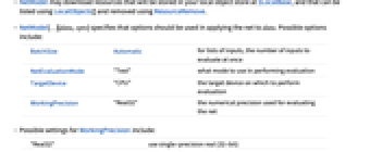 BatchSize Automatic for lists of inputs, the number of inputs to evaluate at once NetEvaluationMode "Test" what mode to use in performing evaluation TargetDevice "CPU" the target device on which to perform evaluation WorkingPrecision "Real32" the numerical precision used for evaluating the net - Possible settings for WorkingPrecision include: