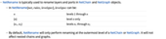 n levels 1 through n {n} level n only {n1,n2} levels n1 through n2 - By default, NetRename will only perform renaming at the outermost level of a NetChain or NetGraph. It will not affect nested chains and graphs.