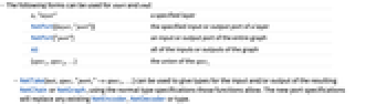 n,"layer" a specified layer NetPort[{layer,"port"}] the specified input or output port of a layer NetPort["port"] an input or output port of the entire graph All all of the inputs or outputs of the graph {spec1,spec2,…} the union of the speci - NetTake[net,spec,"port1"->spec1,…] can be used to give types for the input and/or output of the resulting NetChain or NetGraph, using the normal type specifications those functions allow. The new port specifications will replace any existing NetEncoder, NetDecoder or type.