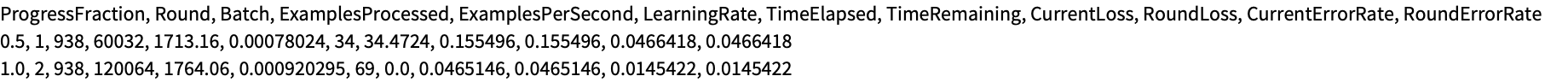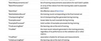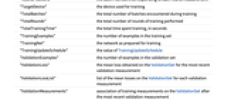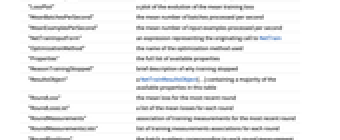 "TrainedNet" the optimal trained network found (default) "BatchesPerRound" the number of batches contained in a single round "BatchLossList" a list of the mean losses for each batch update "BatchMeasurementsLists" list of training measurements associations for each batch update "BatchPermutation" an array of the indices from the training data used to populate each batch "BatchSize" the effective value of BatchSize "BestValidationRound" the training round corresponding to the final trained net "CheckpointingFiles" list of checkpointing files generated during training "ExampleLosses" losses taken by each example during training "ExamplesProcessed" total number of examples processed during training "FinalLearningRate" the learning rate at the end of training "FinalNet" the most recent network generated in the training process, regardless of its performance on the validation set or other metrics "FinalPlots" association of plots for all losses and measurements "InitialLearningRate" the learning rate at the start of training "LossPlot" a plot of the evolution of the mean training loss "MeanBatchesPerSecond" the mean number of batches processed per second "MeanExamplesPerSecond" the mean number of input examples processed per second "NetTrainInputForm" an expression representing the originating call to NetTrain "OptimizationMethod" the name of the optimization method used "Properties" the full list of available properties "ReasonTrainingStopped" brief description of why training stopped "ResultsObject" a NetTrainResultsObject[…] containing a majority of the available properties in this table "RoundLoss" the mean loss for the most recent round "RoundLossList" a list of the mean losses for each round "RoundMeasurements" association of training measurements for the most recent round "RoundMeasurementsLists" list of training measurements associations for each round "RoundPositions" the batch numbers corresponding to each round measurement "TargetDevice" the device used for training "TotalBatches" the total number of batches encountered during training "TotalRounds" the total number of rounds of training performed "TotalTrainingTime" the total time spent training, in seconds "TrainingExamples" the number of examples in the training set "TrainingNet" the network as prepared for training "TrainingUpdateSchedule" the value of TrainingUpdateSchedule "ValidationExamples" the number of examples in the validation set "ValidationLoss" the mean loss obtained on the ValidationSet for the most recent validation measurement "ValidationLossList" list of the mean losses on the ValidationSet for each validation measurement "ValidationMeasurements" association of training measurements on the ValidationSet after the most recent validation measurement "ValidationMeasurementsLists" list of training measurements associations on the ValidationSet for each validation measurement "ValidationPositions" the batch numbers corresponding to each validation measurement "WeightsLearningRateMultipliers" an association of the learning rate multiplier used for each weight - An association of the form <|"Property"->prop,"Form"->form,"Interval"->int|> can be used to specify a custom property whose value will be collected repeatedly during training.
