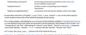 - For a custom property, valid settings for prop can be any of the properties available in TrainingProgressFunction, or a user-defined function that is given the association of all the properties. Valid settings for form include "List", "TransposedList" and "Plot". Valid settings for "Interval" can be "Batch", "Round" or a Quantity[…]. Supported units include "Batches", "Rounds", "Percent" and time units like "Seconds", "Minutes" and "Hours".