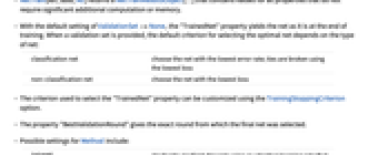 - With the default setting of ValidationSet->None, the "TrainedNet" property yields the net as it is at the end of training. When a validation set is provided, the default criterion for selecting the optimal net depends on the type of net: