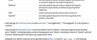 "ADAM" stochastic gradient descent using an adaptive learning rate that is invariant to diagonal rescaling of the gradients "RMSProp" stochastic gradient descent using an adaptive learning rate derived from exponentially smoothed average of gradient magnitude "SGD" ordinary stochastic gradient descent with momentum "SignSGD" stochastic gradient descent for which the magnitude of the gradient is discarded - Valid settings for PerformanceGoal include Automatic, "TrainingMemory", "TrainingSpeed" or a list of goals to combine.