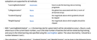 "LearningRateSchedule" Automatic how to scale the learning rate as training progresses "L2Regularization" None the global loss associated with the L2 norm of all learned arrays "GradientClipping" None the magnitude above which gradients should be clipped "WeightClipping" None the magnitude above which weights should be clipped - With "LearningRateSchedule"->f, the learning rate for a given batch will be calculated as initial*f[batch,total], where batch is the current batch number, total is the total number of batches that will be visited during training, and initial is the initial learning rate specified using the LearningRate option. The value returned by f should be a number between 0 and 1.
