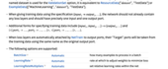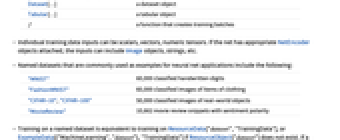 "dataset" a named dataset {input1output1,…} a list of Rule instances between input and output {input1,…}->{output1,…} a Rule between inputs and corresponding outputs {port1…,…,…} a list of associations with inputs for the specified ports port1{data11,data12,…},… a association of lists of input for the specified ports Dataset[…] a dataset object Tabular[…] a tabular object f a function that creates training batches - Individual training data inputs can be scalars, vectors, numeric tensors. If the net has appropriate NetEncoder objects attached, the inputs can include Image objects, strings, etc.