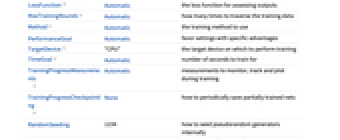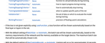 BatchSize Automatic how many examples to process in a batch LearningRate Automatic rate at which to adjust weights to minimize loss LearningRateMultipliers Automatic set relative learning rates within the net LossFunction Automatic the loss function for assessing outputs MaxTrainingRounds Automatic how many times to traverse the training data Method Automatic the training method to use PerformanceGoal Automatic favor settings with specific advantages TargetDevice "CPU" the target device on which to perform training TimeGoal Automatic number of seconds to train for TrainingProgressMeasurements Automatic measurements to monitor, track and plot during training TrainingProgressCheckpointing None how to periodically save partially trained nets RandomSeeding 1234 how to seed pseudorandom generators internally TrainingProgressFunction None function to call periodically during training TrainingProgressReporting Automatic how to report progress during training TrainingStoppingCriterion None how to automatically stop training TrainingUpdateSchedule Automatic when to update specific parts of the net ValidationSet None the set of data on which to evaluate the model during training WorkingPrecision Automatic precision of floating-point calculations - If the loss is not given explicitly using LossFunction, a loss function will be chosen automatically based on the final layer or layers in the net.