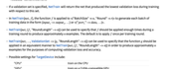 - NetTrain[net,…,ValidationSet->{g,"RoundLength"->n}] can be used to specify that the function g should be applied in an equivalent manner to NetTrain[net,{f,"RoundLength"->n}] in order to produce approximately n examples for the purposes of computing validation loss and accuracy.