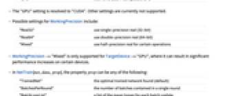 "Real32" use single-precision real (32-bit) "Real64" use double-precision real (64-bit) "Mixed" use half-precision real for certain operations - WorkingPrecision->"Mixed" is only supported for TargetDevice->"GPU", where it can result in significant performance increases on certain devices.