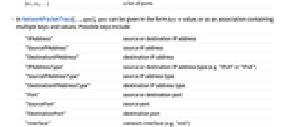 n single port number n nmin;;nmax a range of ports from nmin to nmax {n1,n2,…} a list of ports - In NetworkPacketTrace[…,spec], spec can be given in the form keyvalue, or as an association containing multiple keys and values. Possible keys include: