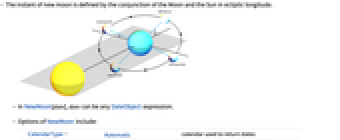 CalendarType Automatic calendar used to return dates DateFormat Automatic format used to display output dates DateGranularity Automatic calendar granularity of output dates Method "EclipticLongitude" method to define moon phases TimeDirection 1 whether to return the next or last new moon TimeSystem Automatic time system of output dates TimeZone $TimeZone time zone of output dates - Possible settings for the Method option include: