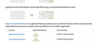 - NeymanScottPointProcess models clustered point configurations with centers placed according to an inhomogeneous Poisson point process and cluster points distributed around the centers according to a cluster distribution.