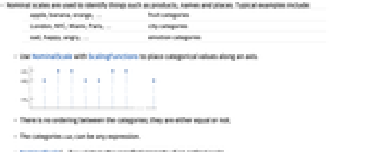 apple,banana,orange, … fruit categories London,NYC,Miami,Paris,… city categories sad,happy,angry, … emotion categories - Use NominalScale with ScalingFunctions to place categorical values along an axis.