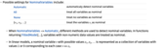 Automatic automaticaly detect nominal variables All treat all variables as nominal None treat no variables as nominal {v1,v2,…} treat the variables vi as nominal - When NominalVariables->Automatic, different methods are used to detect nominal variables. In functions returning FittedModel[…], variables with non-numeric data values are treated as nominal.