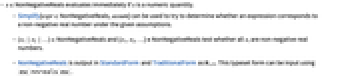 - Simplify[expr∈NonNegativeReals,assum] can be used to try to determine whether an expression corresponds to a non-negative real number under the given assumptions.