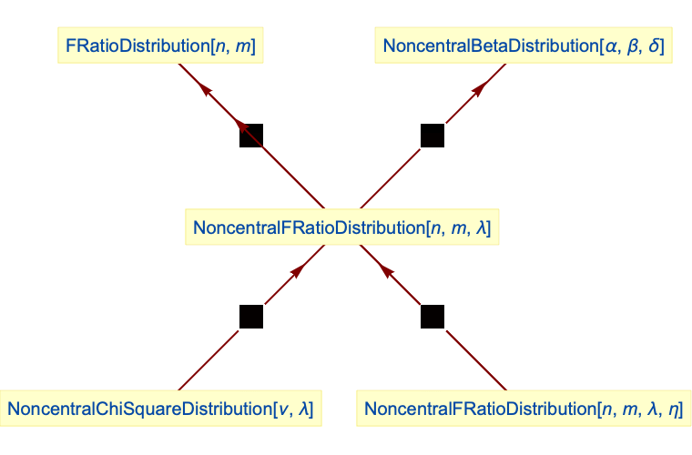 - NoncentralFRatioDistribution is related to a number of other distributions. It is an immediate generalization of FRatioDistribution, in the sense that the PDF of both NoncentralFRatioDistribution[n,m,0,0] and NoncentralFRatioDistribution[n,m,0] are precisely the same as that of FRatioDistribution[n,m]. NoncentralFRatioDistribution can be realized as a transformation (TransformedDistribution) of both NoncentralChiSquareDistribution and NoncentralBetaDistribution and is also closely related to ChiDistribution, ChiSquareDistribution, StudentTDistribution, LaplaceDistribution, and FisherZDistribution.