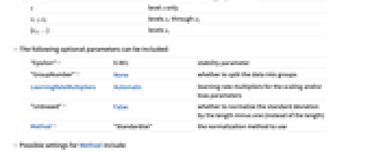 "Epsilon" 0.001 stability parameter "GroupNumber" None whether to split the data into groups LearningRateMultipliers Automatic learning rate multipliers for the scaling and/or bias parameters "Unbiased" False whether to normalize the standard deviation by the length minus one (instead of the length) Method "Standardize" the normalization method to use - Possible settings for Method include: