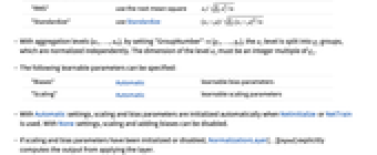 "Biases" Automatic learnable bias parameters "Scaling" Automatic learnable scaling parameters - With Automatic settings, scaling and bias parameters are initialized automatically when NetInitialize or NetTrain is used. With None settings, scaling and adding biases can be disabled.