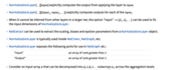 - When it cannot be inferred from other layers in a larger net, the option "Input"->{d1,d2,…} can be used to fix the input dimensions of NormalizationLayer.