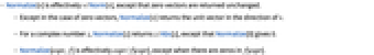 - Normalize[v] is effectively v/Norm[v], except that zero vectors are returned unchanged.