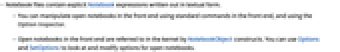 - Open notebooks in the front end are referred to in the kernel by NotebookObject constructs. You can use Options and SetOptions to look at and modify options for open notebooks.