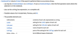 CellContents contents of each cell, represented as a string CellID setting for the CellID option of each cell CellLabel setting for the CellLabel option of each cell CellStyle name of style for each cell CellTags parts of the setting for the CellTags option for each cell {elem1,elem2,…} list of different types of elements - The default for elems is CellContents. Only the contents of boxes, not their styles or options, are included in the search.