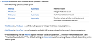 Method Automatic method to use Modulus 0 integer modulus to use Tolerance Automatic numerical tolerance to use ZeroTest Automatic function to test whether matrix elements should be considered to be zero - NullSpace[m,Modulus->n] finds the null space of rational matrices modulo the integer n. If n is zero, ordinary arithmetic is used. If n is not prime, the computation may fail. »
