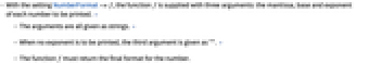 - With the setting NumberFormat->f, the function f is supplied with three arguments: the mantissa, base and exponent of each number to be printed. »