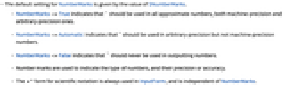- NumberMarks->True indicates that ` should be used in all approximate numbers, both machine‐precision and arbitrary‐precision ones.