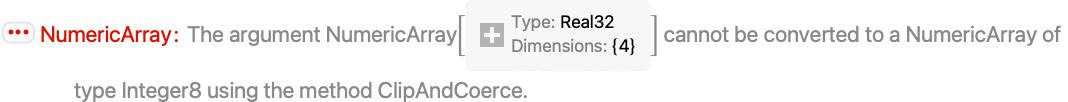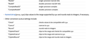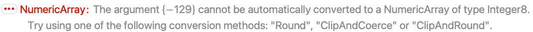 "Check" checks values to be compatible with type "Coerce" coerces to type "Round" rounds reals to integers "ClipAndCheck" clips to the range and checks for compatible type "ClipAndCoerce" clips to the range and coerces to type "ClipAndRound" clips to the range and rounds reals to integers - For complex numbers, the method is applied separately to real and imaginary parts.