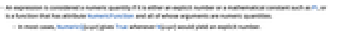 - An expression is considered a numeric quantity if it is either an explicit number or a mathematical constant such as Pi, or is a function that has attribute NumericFunction and all of whose arguments are numeric quantities.