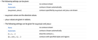 None no contours drawn Automatic contours chosen automatically {c1,c2,…} draw the contours ci {{c1,style1,r1},…} contours with specified styles and regions - The default setting for stylei is Dashed for magnitude contours and Dotted for phase contours.