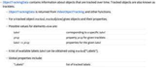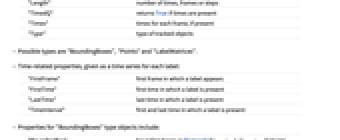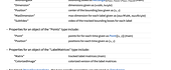 "Labels" list of tracked labels "Length" number of times, frames or steps "TimedQ" returns True if times are present "Times" times for each frame, if present "Type" type of tracked objects - Possible types are "BoundingBoxes", "Points" and "LabelMatrices".