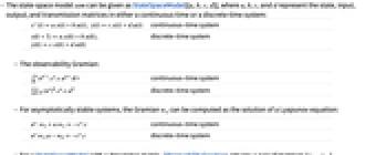 - The state-space model ssm can be given as StateSpaceModel[{a,b,c,d}], where a, b, c, and d represent the state, input, output, and transmission matrices in either a continuous-time or a discrete-time system: