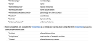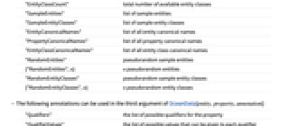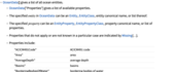 "Entities" all available entities "EntityCount" total number of available entities "Classes" all available entity classes "EntityClassCount" total number of available entity classes "SampleEntities" list of sample entities "SampleEntityClasses" list of sample entity classes "EntityCanonicalNames" list of all entity canonical names "PropertyCanonicalNames" list of all property canonical names "EntityClassCanonicalNames" list of all entity class canonical names "RandomEntities" pseudorandom sample entities {"RandomEntities",n} n pseudorandom entities "RandomEntityClasses" pseudorandom sample entity classes {"RandomEntityClasses",n} n pseudorandom entity classes - The following annotations can be used in the third argument of OceanData[entity,property,annotation]: