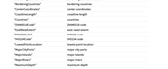 "ACICM491Code" ACICM491 code "Area" area "AverageDepth" average depth "Basins" basins "BorderingBodiesOfWater" bordering bodies of water "BorderingCountries" bordering countries "CenterCoordinates" center coordinates "CoastlineLength" coastline length "Countries" countries "DIAM6518Code" DIAM6518 code "EastWestExtent" east-west extent "IHO233Code" IHO233 code "IHO234Code" IHO234 code "LowestPointLocation" lowest point location "MajorCityPorts" major city ports "MajorIslands" major islands "MajorRivers" major rivers "MaximumDepth" maximum depth "Memberships" memberships "Name" name "NaturalResources" natural resources "NorthSouthExtent" north-south extent "PercentAreaOfEarthsSurface" percentage of Earth's surface "Position" coordinates "Salinity" typical salinity "UnderseaFeatures" undersea features - Some properties are available for OceanData as a whole and can be given using the form OceanData[property]. Such properties include: