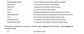 "Qualifiers" the list of possible qualifiers for the property "QualifierValues" the list of possible values that can be given to each qualifier "DefaultQualifierValues" the list of default values for the property's qualifiers "Description" a brief textual description of the property "Definition" a detailed textual definition of the property "Source" source information for the property "Date" the date associated with the entity-property value (if any) "PhysicalQuantity" the physical quantity associated with the entity-property value "Unit" the unit associated with the entity-property value "EntityAssociation" an association of entities and entity-property values "PropertyAssociation" an association of properties and entity-property values - If a function is provided as an annotation, it will be used to aggregate the result data. Typical aggregation functions include:
