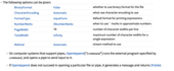 BinaryFormat False whether to use binary format for the file CharacterEncoding Automatic what raw character encoding to use FormatType InputForm default format for printing expressions NumberMarks $NumberMarks when to use ` marks in approximate numbers PageWidth 78 number of character widths per line TotalWidth Infinity maximum number of character widths for a single expression Method Automatic stream method to use - On computer systems that support pipes, OpenAppend["!command"] runs the external program specified by command, and opens a pipe to send input to it.