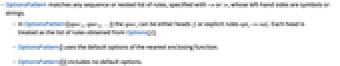 - OptionsPattern matches any sequence or nested list of rules, specified with -> or :>, whose left-hand sides are symbols or strings.