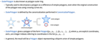 - OuterPolygon gives a polygon of the form Polygon[{p1,p2,…},{{i1,i2,…},…}], where pk are explicit coordinates, and ik are integer indexes referring to coordinates in the list {p1,p2,…}.