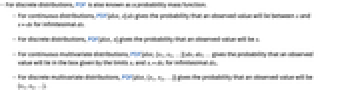 - For continuous distributions, PDF[dist,x] dx gives the probability that an observed value will lie between x and x+dx for infinitesimal dx.