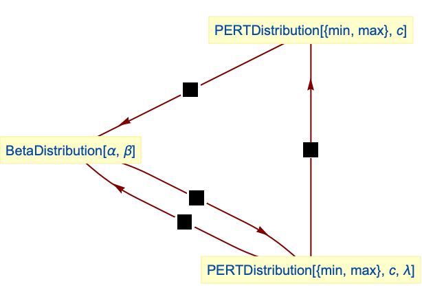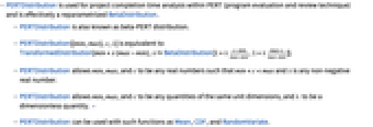 - PERTDistribution[{min,max},c,λ] is equivalent to TransformedDistribution[min+x(max-min),xBetaDistribution[1+λ
