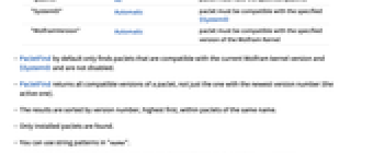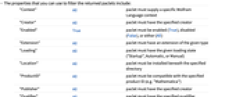 "Context" All paclet must supply a specific Wolfram Language context "Creator" All paclet must have the specified creator "Enabled" True paclet must be enabled (True), disabled (False), or either (All) "Extension" All paclet must have an extension of the given type "Loading" All paclet must have the given loading state ("Startup", Automatic, or Manual) "Location" All paclet must be installed beneath the specified directory "ProductID" All paclet must be compatible with the specified product ID (e.g. "Mathematica") "Publisher" All paclet must have the specified creator "Qualifier" All paclet must have the specified quailifier "SystemID" Automatic paclet must be compatible with the specified $SystemID "WolframVersion" Automatic paclet must be compatible with the specified version of the Wolfram Kernel - PacletFind by default only finds paclets that are compatible with the current Wolfram kernel version and $SystemID and are not disabled.