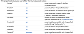 "Context" All paclet must supply a specific Wolfram Language context "Creator" All paclet must have the specified creator "Extension" All paclet must have an extension of the given type "Loading" All paclet must have the given loading state ("Startup", Automatic or Manual) "Location" All the site on which the paclet must reside, specified as either a URL or a PacletSiteObject "ProductID" All paclet must be compatible with the specified product ID (e.g. "Mathematica") "Publisher" All paclet must have the specified creator "Qualifier" All paclet must have the specified quailifier "SystemID" Automatic paclet must be compatible with the specified $SystemID "WolframVersion" Automatic paclet must be compatible with the specified version of the Wolfram kernel - The following option is supported: