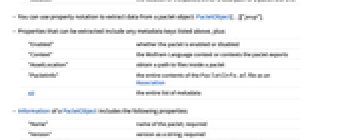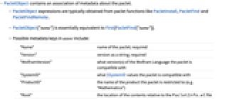 "Name" name of the paclet; required "Version" version as a string; required "WolframVersion" what version(s) of the Wolfram Language the paclet is compatible with "SystemID" what $SystemID values the paclet is compatible with "ProductID" the name of the product the paclet is restricted to (e.g. "Mathematica") "Root" the location of the contents relative to the PacletInfo.wl file "Loading" when the paclet's .wl files load "AutoUpdating" whether the paclet automatically updates itself "Description" short description of the paclet "Category" a category or list of categories describing the functionality "Keywords" keywords relevant to the functionality "Creator" author or company information "Publisher" publisher information "DocumentationURL" base URL for the paclet's web documentation "URL" a URL to a home page for the paclet "Support" where to go for support "Icon" relative path to a file containing an icon image "UUID" a unique ID "Extensions" specification of what the paclet provides "Location" the location of the paclet, either a local path or a paclet site URL - You can use property notation to extract data from a paclet object: PacletObject[…]["prop"].