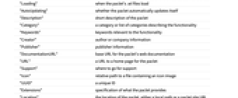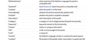 "Name" name of the paclet; required "Version" version as a string; required "WolframVersion" what version(s) of the Wolfram Language the paclet is compatible with "SystemID" list of $SystemID values the paclet is compatible with "Loading" when the paclet's .wl files load "AutoUpdating" whether the paclet automatically updates itself "Enabled" whether the paclet is enabled or disabled "Description" short description of the paclet "Category" a category or list of categories describing the functionality "Keywords" keywords relevant to the functionality "Creator" author or company information "URL" a URL to a home page for the paclet "UUID" a unique ID "Context" the Wolfram Language context or contexts the paclet exports "Location" the location of the paclet, either a local path or a paclet site URL