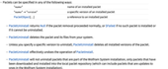 "name" name of an installed paclet "name""version" a specific version of an installed paclet PacletObject[…] a reference to an installed paclet - PacletUninstall returns Null if the paclet removal proceeded normally, or $Failed if no such paclet is installed or if it cannot be uninstalled.