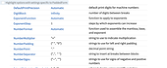 DefaultPrintPrecision Automatic default print digits for machine numbers DigitBlock Infinity number of digits between breaks ExponentFunction Automatic function to apply to exponents ExponentStep 1 steps by which exponents can increase NumberFormat Automatic function used to assemble the mantissa, base, and exponent NumberMultiplier "×" string to use to indicate multiplication NumberPadding {" ","0"} strings to use for left and right padding NumberPoint "." decimal point string NumberSeparator {",", " "} string to insert at breaks between blocks NumberSigns {"-",""} strings to use for signs of negative and positive numbers ScientificNotationThreshold {-5,6} where to begin using scientific notation SignPadding False whether to insert padding after the sign