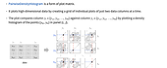 - The plot compares column yi={y1i,y2i,…,ymi} against column yj={y1j,y2j,…,ymj} by plotting a density histogram of the points {ykj,yki} in panel {i,j}.
